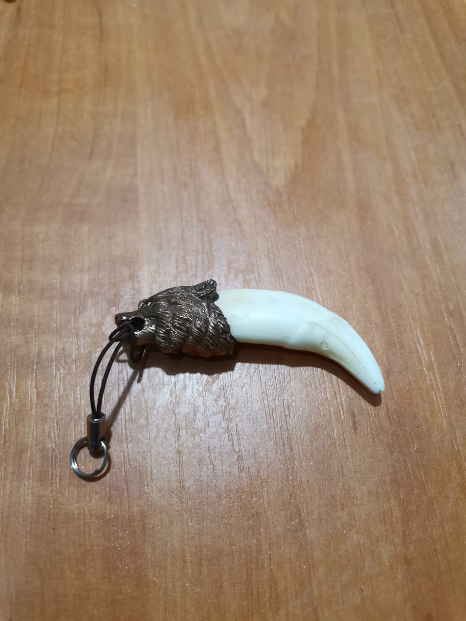 Клык волка с головой из металла – прекрасный сувенир и оберег для мужчин и женщин. Полированный зуб длиной 5 см с медным оголовьем, выполненным профессиональным художником может служить брелоком для ключей, подвеской, кулоном. Длина изделия – 7 см. Для мужчин амулет является символом силы, ума, храбрости. Для женщин – означать верность, преданность семье, способность защитить детей и отстоять свои интересы. В старину верили, что волчий клык в качестве амулета мог передать человеку силу, бесстрашие, выносливость зверя. Охотникам, носящим на теле клык, сопутствует удача. Воинам он придает мужественность, желание победы над врагом.