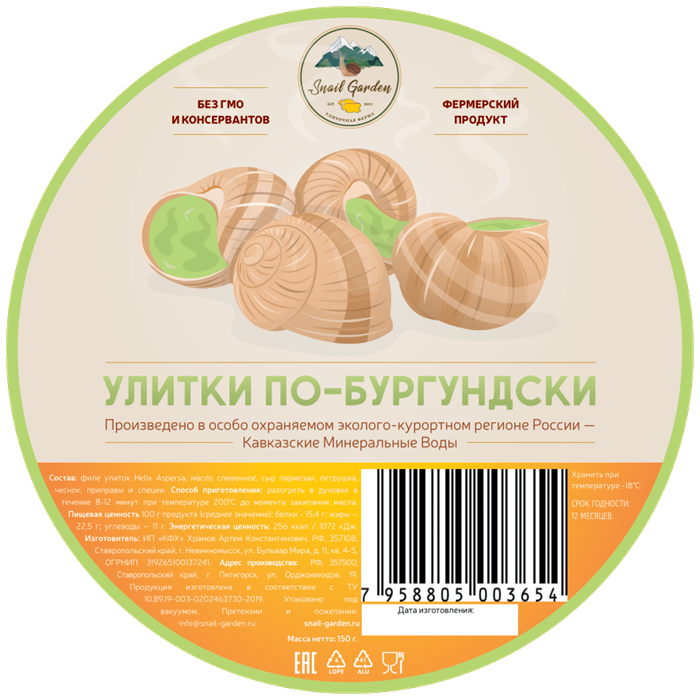 Состав: филе улиток Helix Aspersa, масло сливочное, сыр пармезан, петрушка, чеснок, приправы и специи