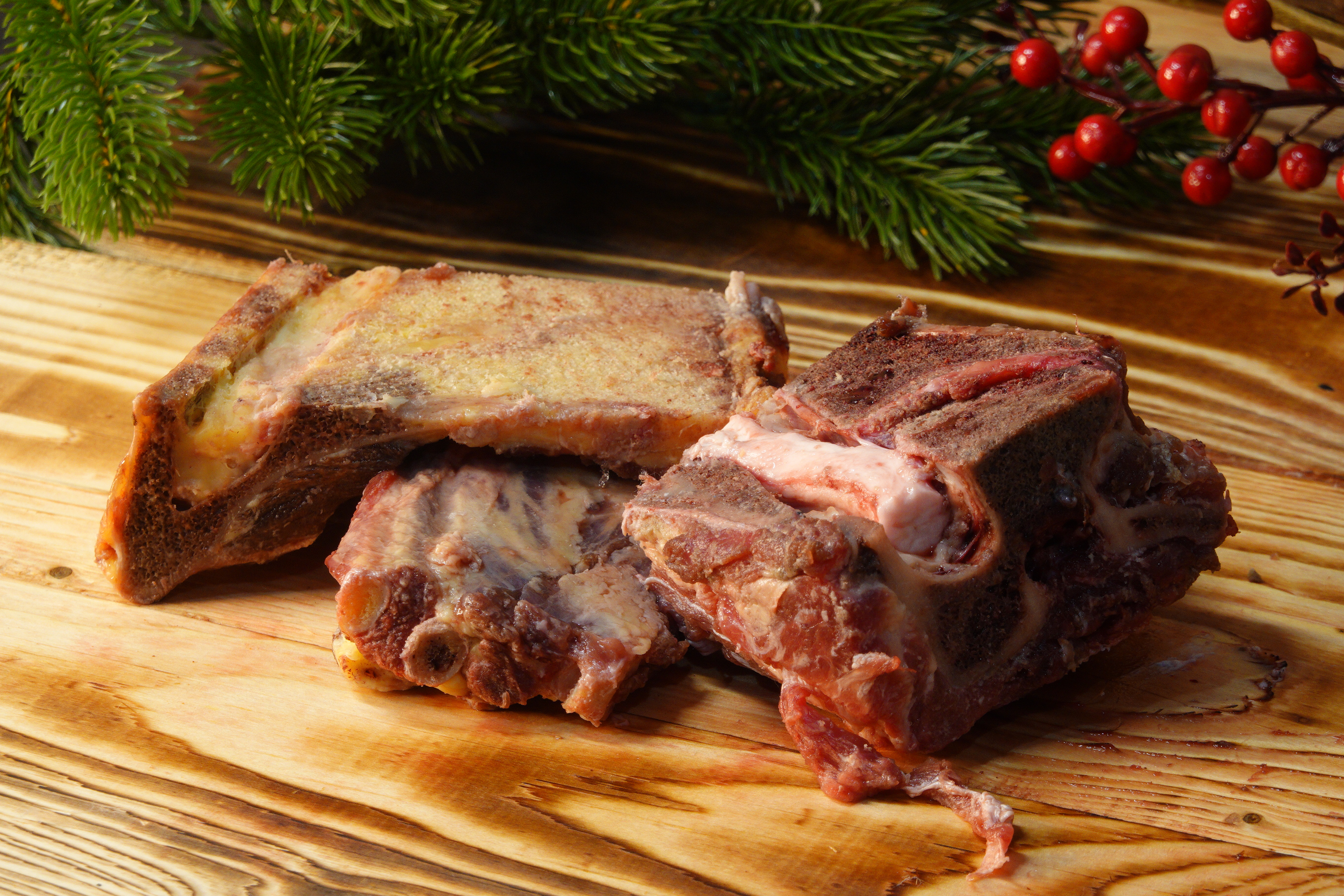 Мясо на кости сравнительно суховато и жестковато, подобно суповой говядине.